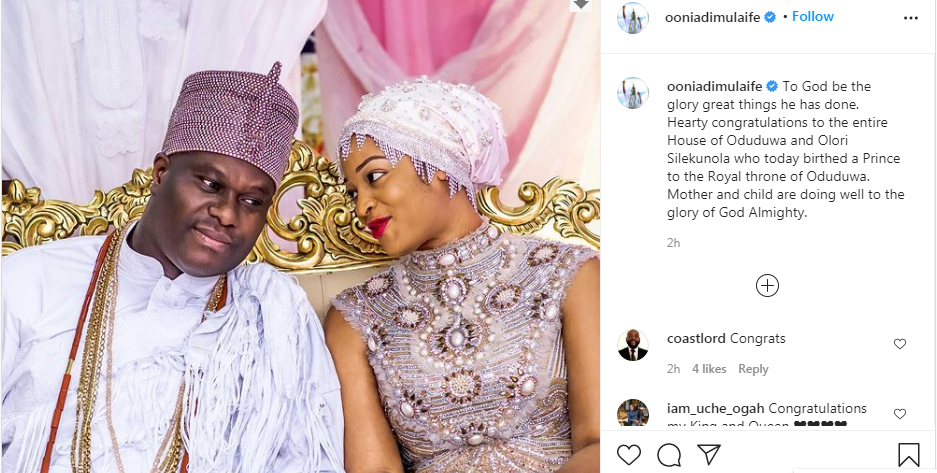 “To God be the glory great things he has done. Hearty congratulations to the entire House of Oduduwa and Olori Silekunola who today birthed a Prince to the Royal throne of Oduduwa. Mother and child are doing well to the glory of God Almighty,” he wrote.