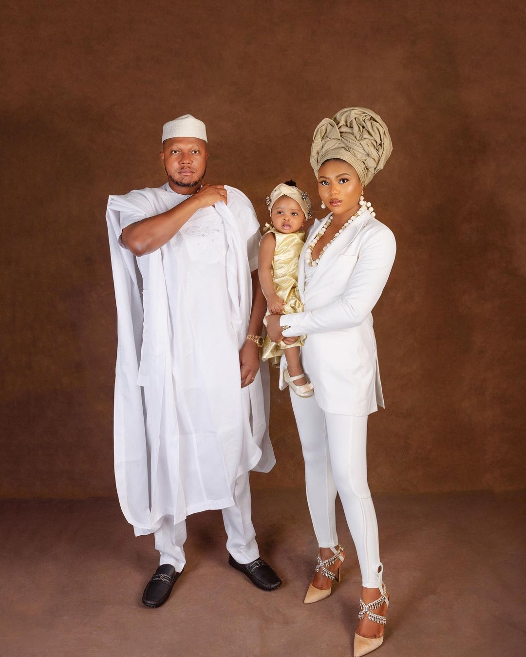 Taking to the photo-sharing platform, Instagram, the media personality shared photos of her adorable family; husband, daughter and her very self. In one photo, Coker and husband could be seen donning white attire posing with their daughter, Ariella Iremide Adunni who donned gold. She also shared adorable photos of Arie alone in lovely pink dress.