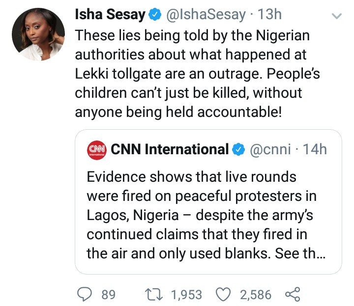 She tweeted: “These lies being told by the Nigerian authorities about what happened at Lekki tollgate are an outrage. People’s children can’t just be killed, without anyone being held accountable!”
