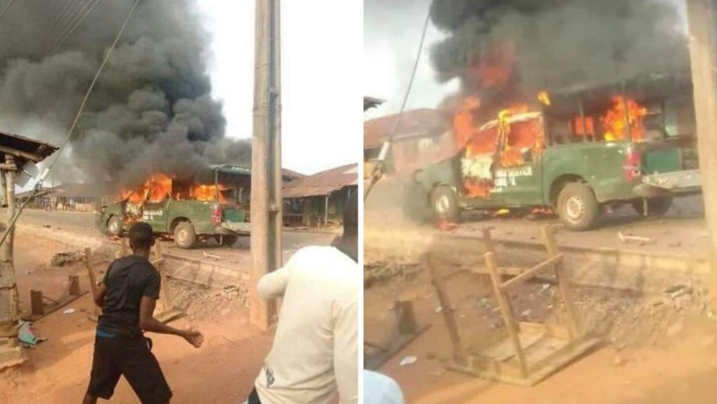 Images garnered on social media saw destruction of Customs’ vehicles by fire.