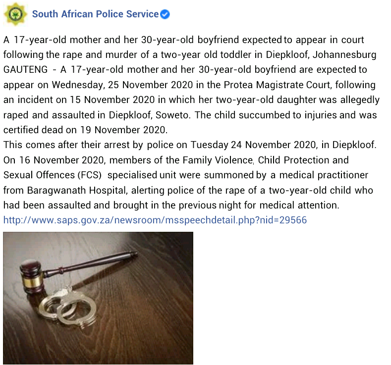 According to the police, on 16 November 2020, members of the Family Violence, Child Protection and Sexual Offences (FCS) specialised unit were summoned by a medical practitioner from Baragwanath Hospital, alerting police of the rape of a two-year-old child who had been assaulted and brought in the previous night for medical attention.