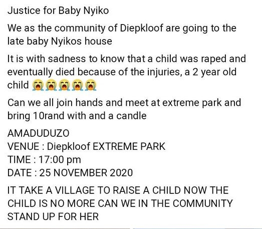 A 2-year-old child, Nyiko has died after allegedly being raped and beaten to death by her teen mother’s 30-year-old boyfriend in Diepkloof, Soweto.