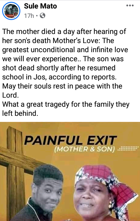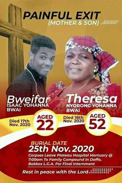 Theresa Nyorong Yohanna Bwai, 52, and her only son, Bweifar Isaac, 22, died hours apart and family and friends of the deceased have taken to social media to mourn their demise.