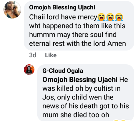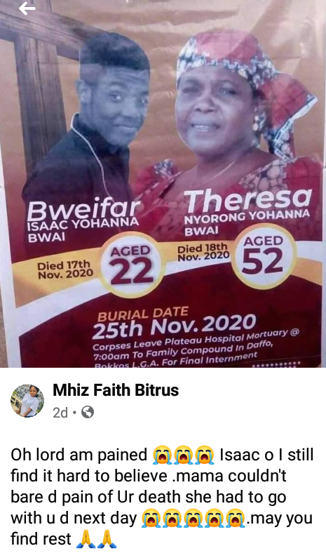 Theresa Nyorong Yohanna Bwai, 52, and her only son, Bweifar Isaac, 22, died hours apart and family and friends of the deceased have taken to social media to mourn their demise.