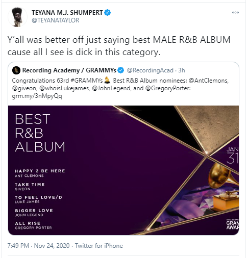 She wrote: “Y’all was better off just saying best MALE R&B ALBUM cause all I see is dick in this category,”