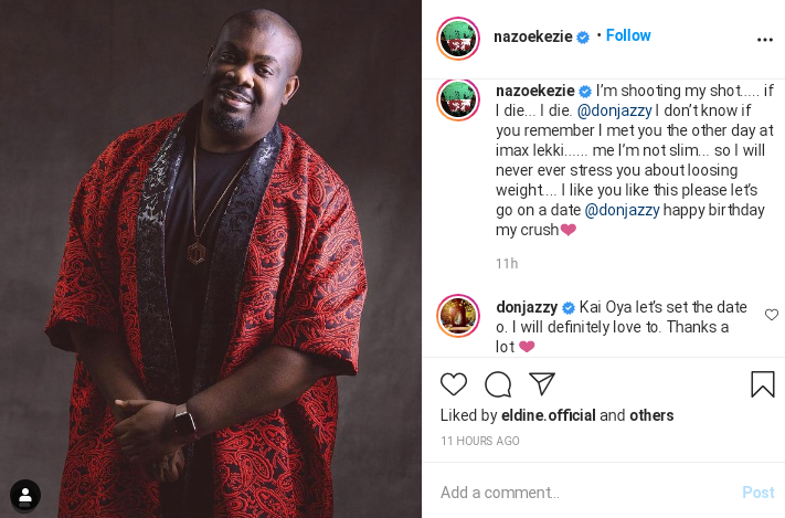 She wrote to Don Jazzy saying, “I’m shooting my shot…If I die….I die. Don Jazzy I don’t know if you remember I met you the other day at Ima Lekki. Me I’m not slim. So I will never ever stress you about losing weight. I like you like this, please. Let’s go for a date. Happy birthday my crush. “
