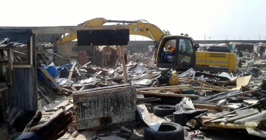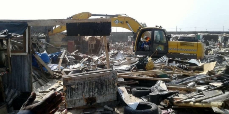 The Operatives of the Lagos State Environmental and Special Offences (Enforcement) Unit (Taskforce) during the weekend demolished over 1,700 illegal shanties and containerised shops around Fagba Railway lines, Agege.