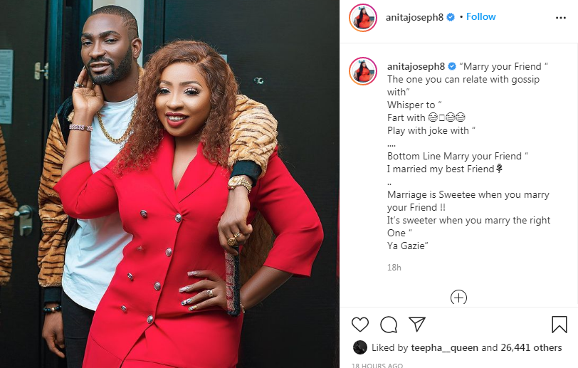 The thespian recently took to her social media page to celebrate her hubby; Mc Fish, while noting that ”marriage is sweeter if you marry your friend”.