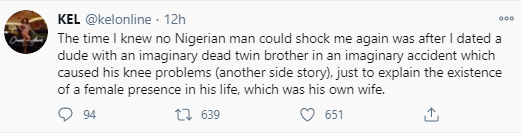 “The time I knew no Nigerian man could shock me again was after I dated a dude with an imaginary dead twin brother in an imaginary accident which caused his knee problems (another side story), just to explain the existence of a female presence in his life, which was his own wife.”