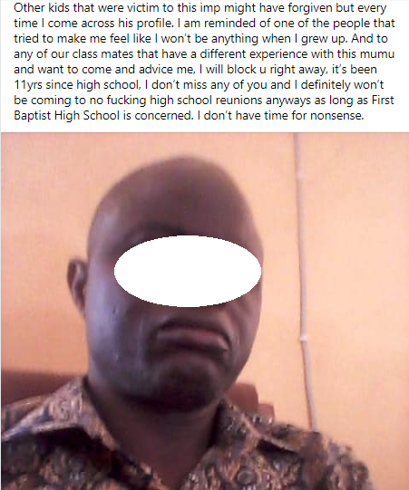 He said 11 years have passed since he graduated but he will never forgive his teacher.