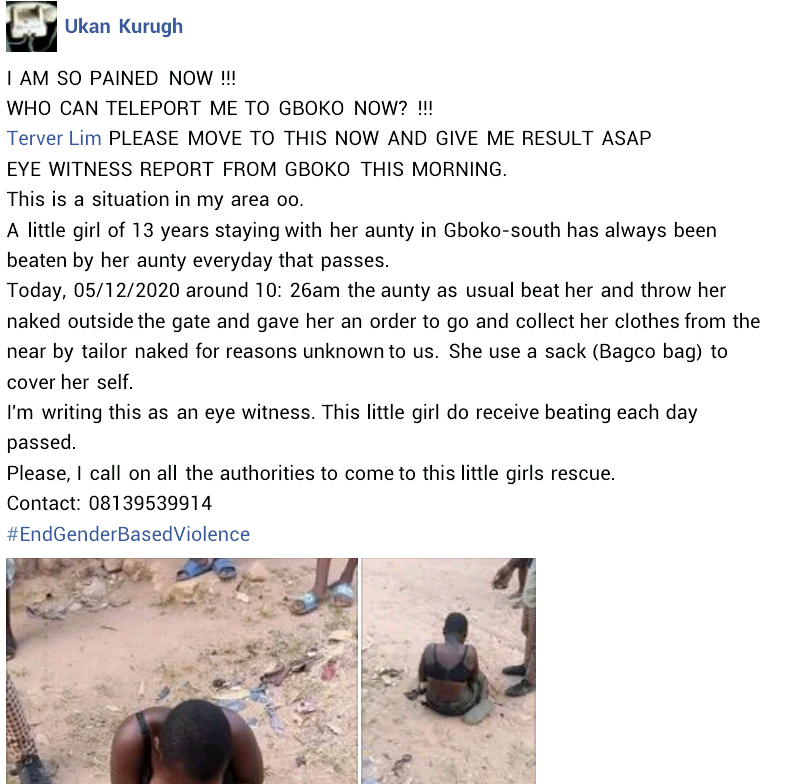 This is a situation in my area oo. A little girl of 13 years staying with her aunty in Gboko-south has always been beaten by her aunty everyday that passes.