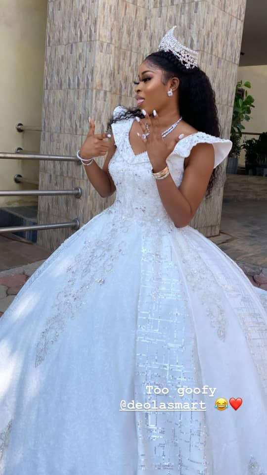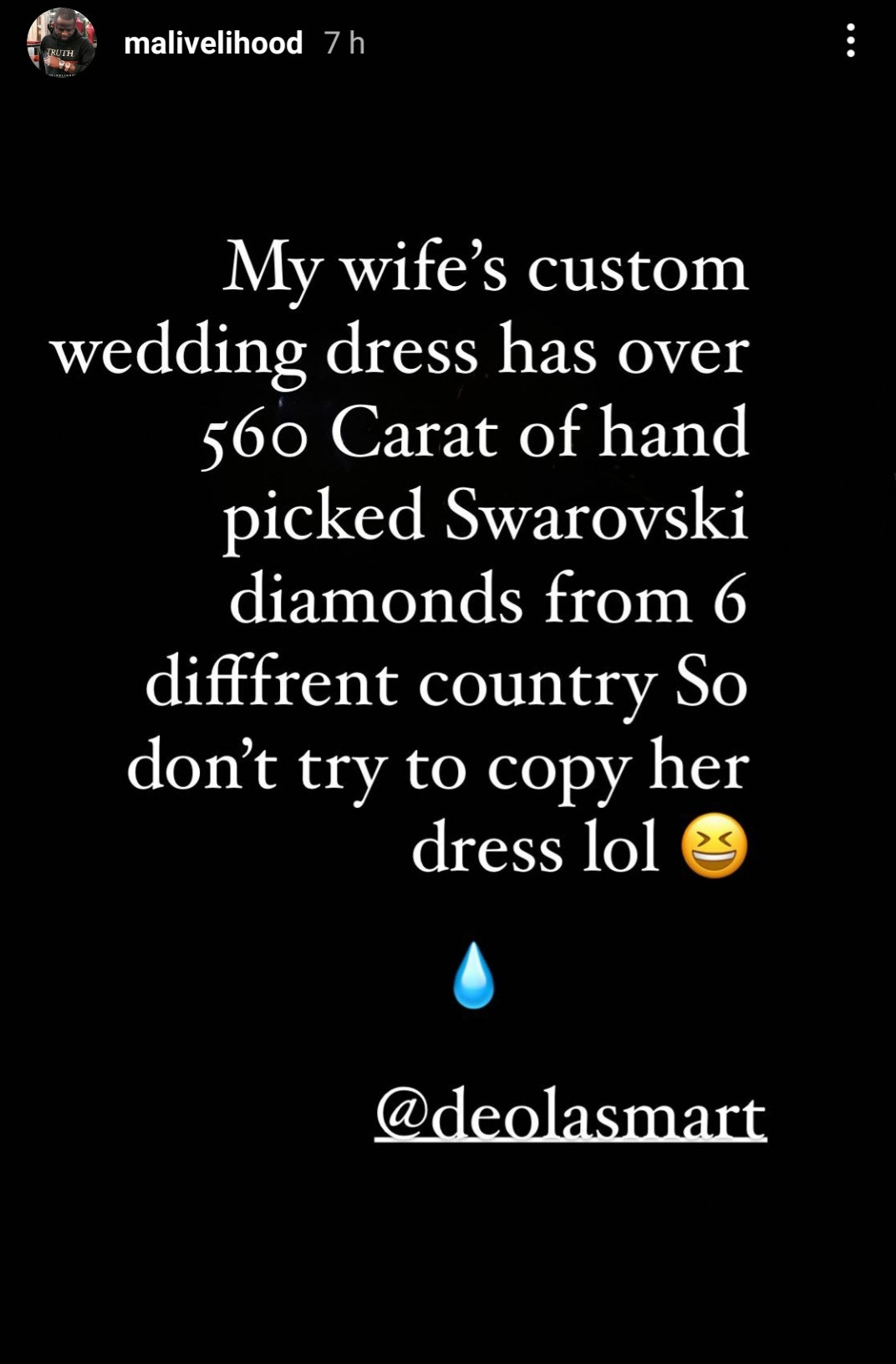 In a post shared on his Instastories, Malivelihood said Deola’s wedding dress was designed with 560 carats of handpicked Swarovski diamonds sourced from six different countries.