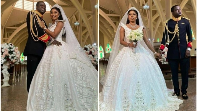 Following the royal church wedding of Michael Awujoola aka Malivelihood and his bride, the luxury designer, has given details of his wife, Deola’s wedding dress.