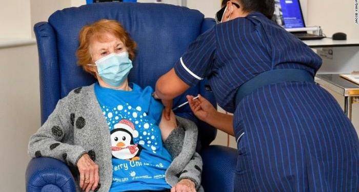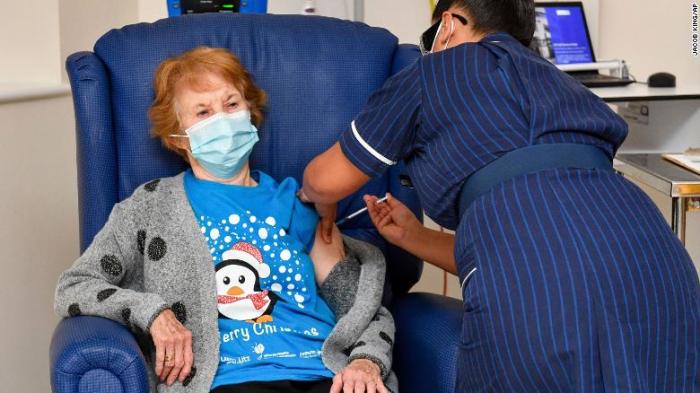 90-year-old Margaret Keenan became the first person to receive the Covid-19 vaccine outside of clinical trials in the United Kingdom since it was approved by UK authorities. She received the first two doses at the University Hospital in Coventry.