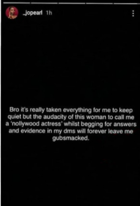 Bro its really taken everything for me to keep quiet but the audacity of this woman to call me a ‘nollywood actress’ whilst begging for answers and evidence in my dms will forever leave me gubsmacked.
