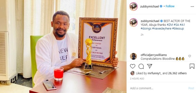 Nigerian actor and producer, Azubuike Michael Egwu professionally known as Zubby Michael, has won the prestigious “Actor of the Year” award.