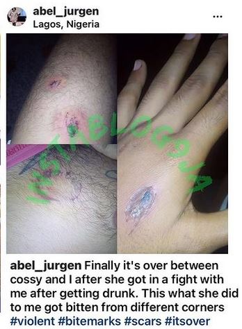“Finally it’s over between Cossy and I after she got in a fight with me after getting drunk. This what she did to me got bitten from different corners”
