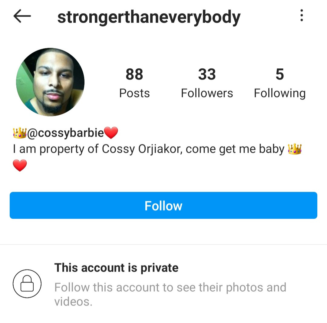His bio reads: “I am property of Cossy Ojiakor. Come get me baby.”