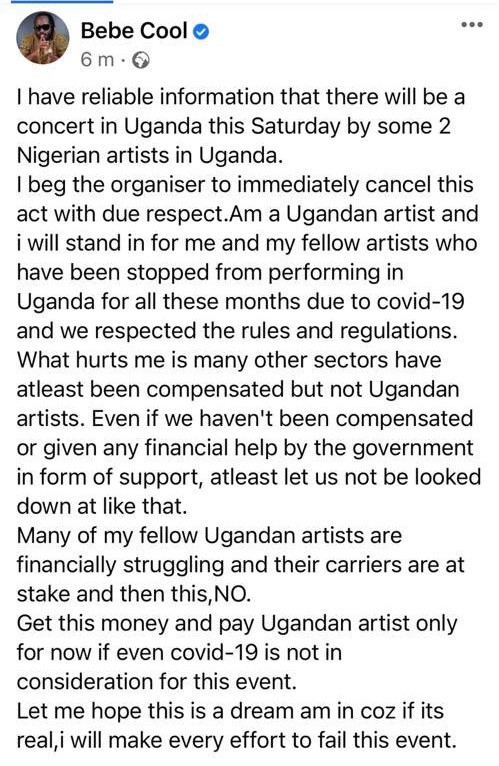 In the post, the singer lamented how other sectors have been compensated with the music industry yet to receive any help from the government. He also stated that his fellow artists were struggling financially, and then urged the organisers to contact Ugandan artistes only for the Saturday event.