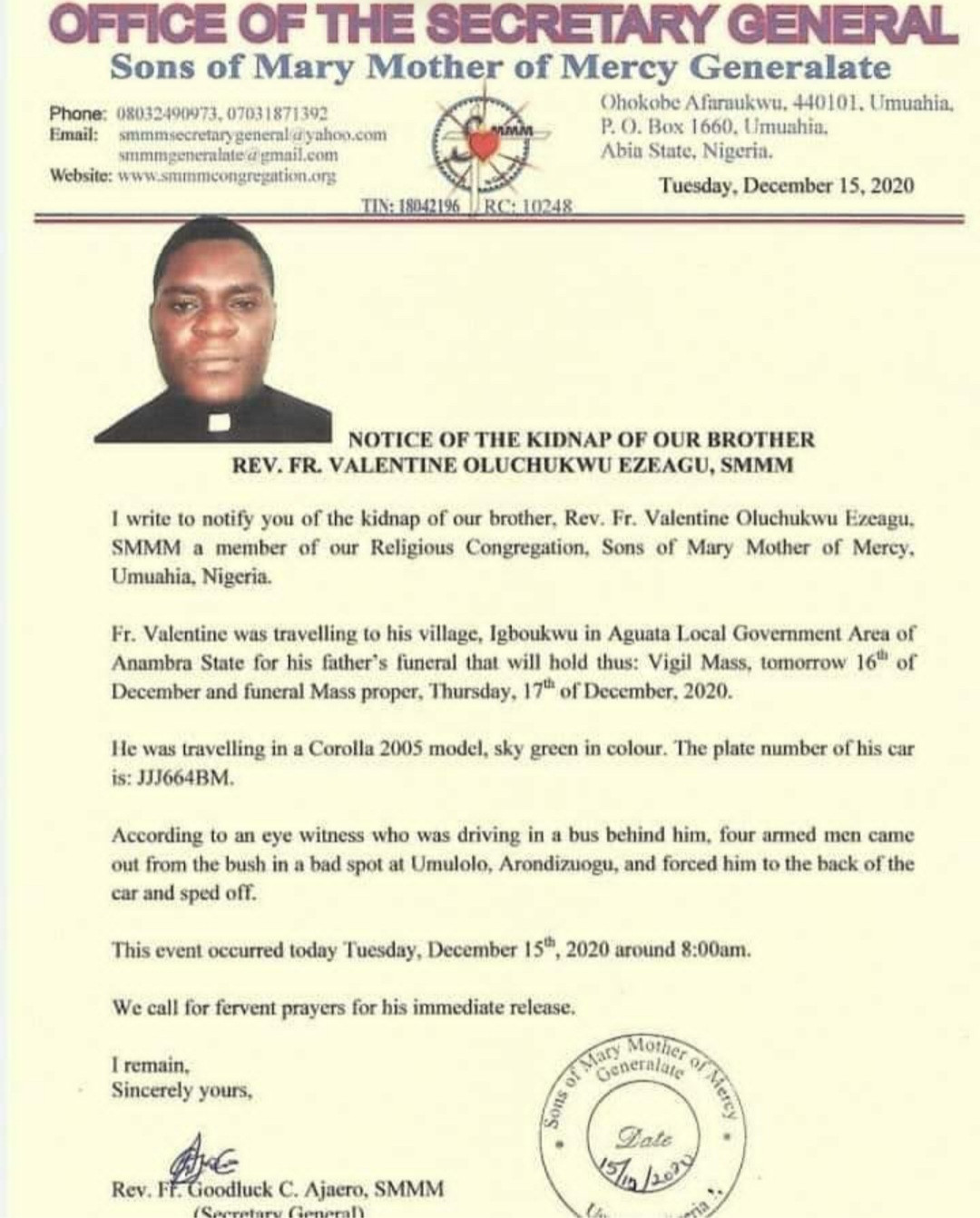 The kidnap took place on Tuesday, Dec 15, the Office of the Secretary General, Sons of Mary Mother of Mercy Generalate announced in a statement.