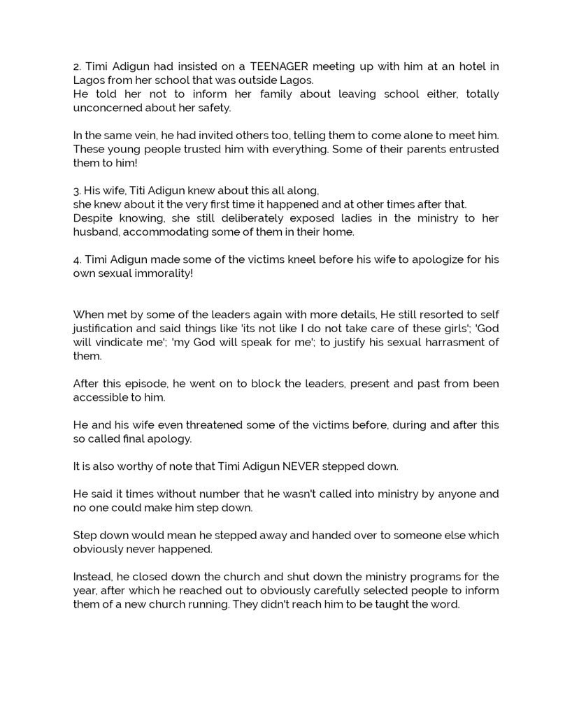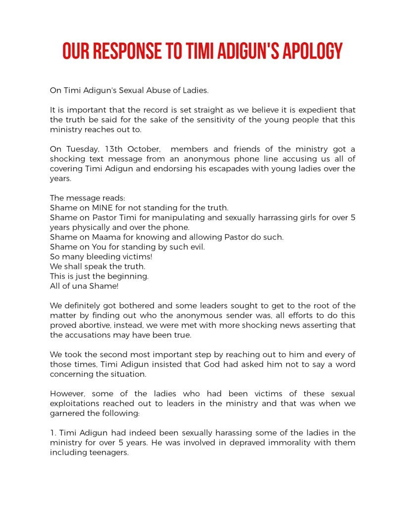 They said their investigations led them to discover that “Timi Adigun had indeed been sexually harassing some of the ladies in the ministry for over 5 years.” They added that he was “involved in depraved morality with them, including teenagers.” He reportedly “insisted on a teenager meeting him at a hotel in Lagos from her school that is outside Lagos” and he “told her not to inform her family”.