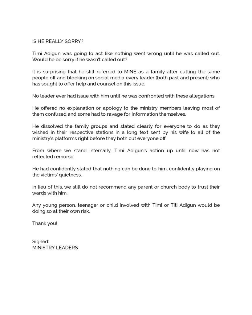 “In lieu of this, we still do not recommend any parent or church body to trust their ward with him. “Any young person, teenager or child involved with Timi or Titi Adigun would be doing so at their own risk.” The statement was signed by “Ministry Leaders ” and released online.
