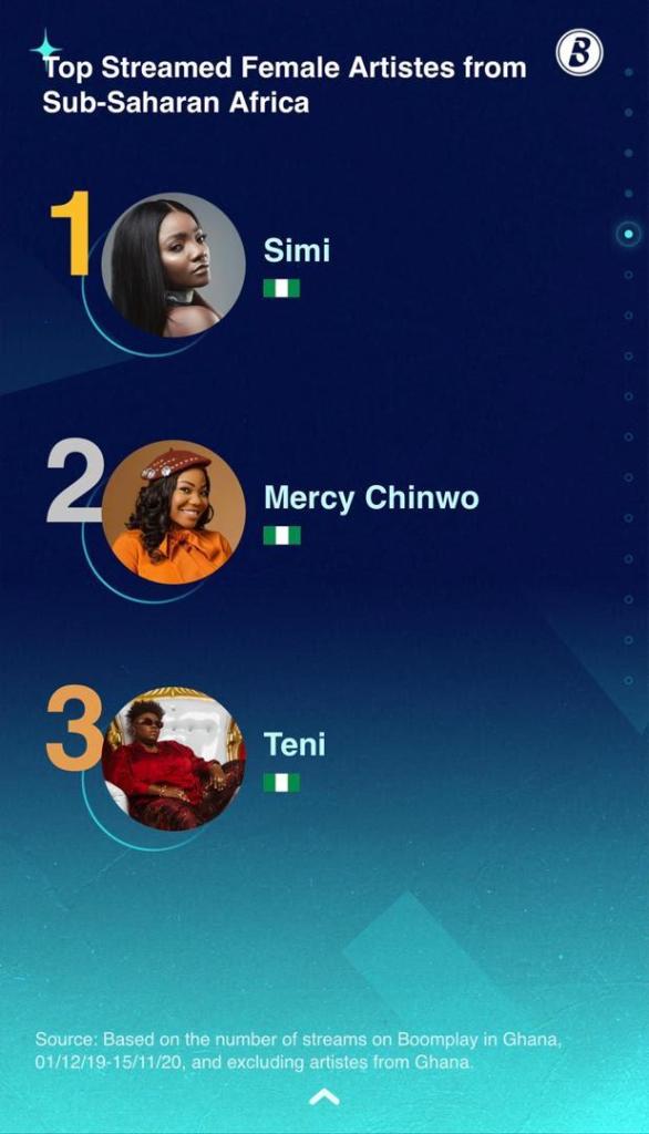 Coming in second is popular gospel singer, Mercy Chinwo, while Teniola Apata also known Teni Makanaki followed in third.
