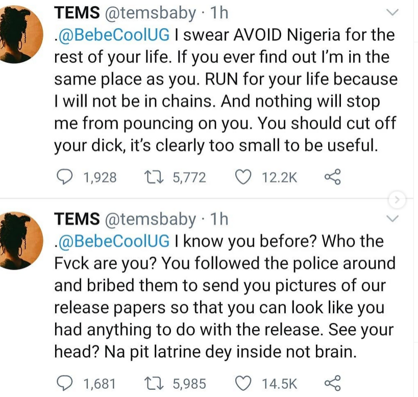 “@BebeCoolUG I know you before? Who the Fvck are you? You followed the police around and bribed them to send you pictures of our release papers so that you can look like you had anything to do with the release. See your head? Na pit latrine dey inside not brain,” she wrote.