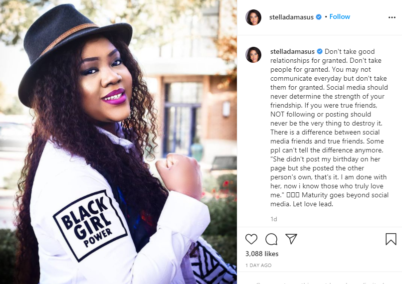 Nollywood actress Stella Damasus has shared a post centered on the need to never take relationships for granted.
