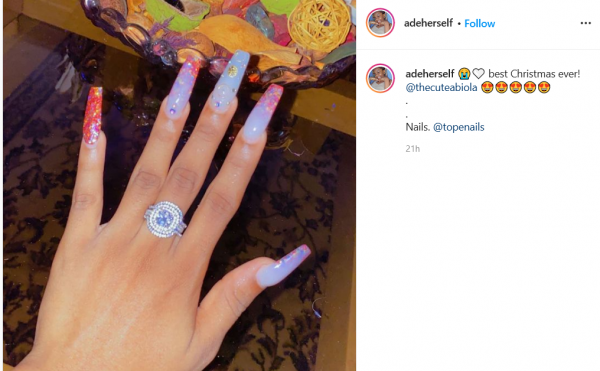 Influencer, Adeherself who was in EFCC’s net earlier this year over a fraud related case, shared a picture of herself showing off an engagement ring and captioned it, “Best Christmas ever! @cuteabiola”.