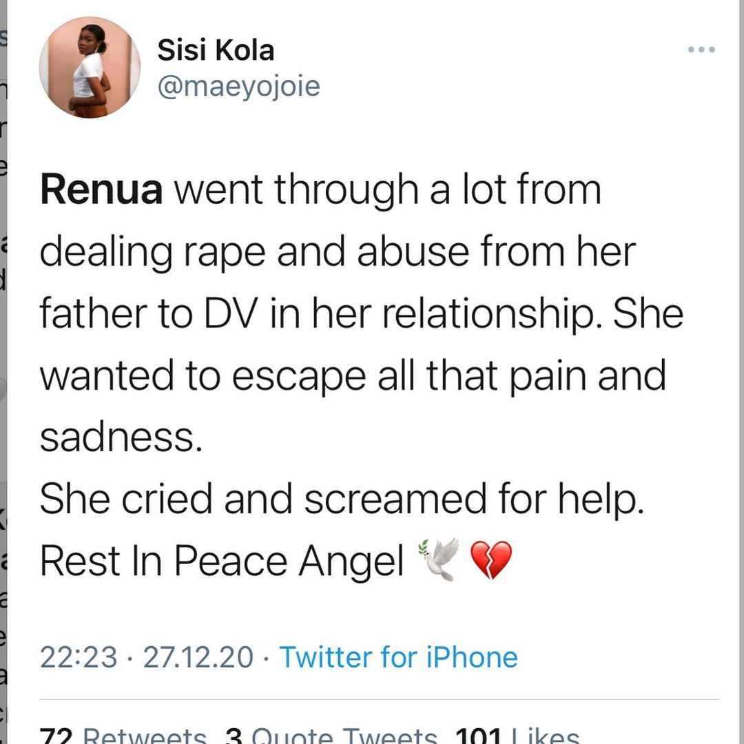 Renua had reportedly taken to her Instagram story on December 26, to reveal that she was going to commit suicide while warning members of her family not to mourn her as they obviously do not care about her.