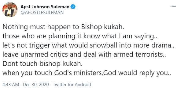 This warning was issued by Apostle Suleman on Wednesday morning, December 30 via his Twitter page.