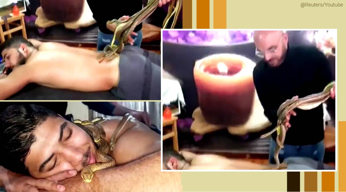 In the spa, live snakes slither on the backs and faces of the people who are desperately looking for pain relief. According to a Reuters video, which has now gone viral on social media, a masseuse is seen first rubbing oil on the client’s back and then uses a combination of pythons and around 28 different types of non-venomous snakes during the 30-minute massage session.