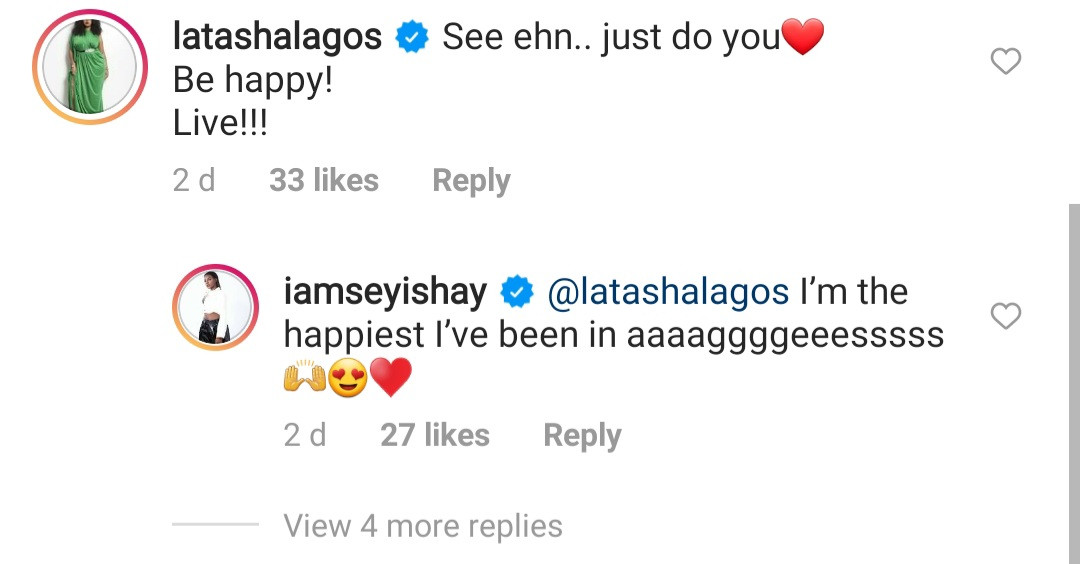 And Seyi Shay responded: “I’m the happiest I’ve been in ages.”