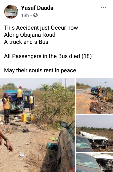 A ghastly accident along Lokoja-Obajana road in Kogi State that occurred on Wednesday afternoon, January 6 has claimed the lives of all the passengers.