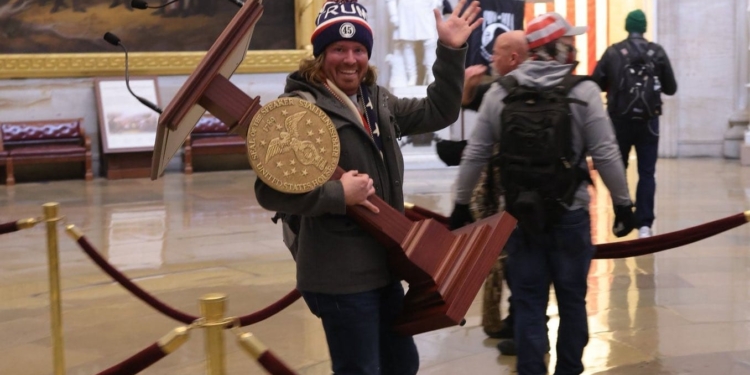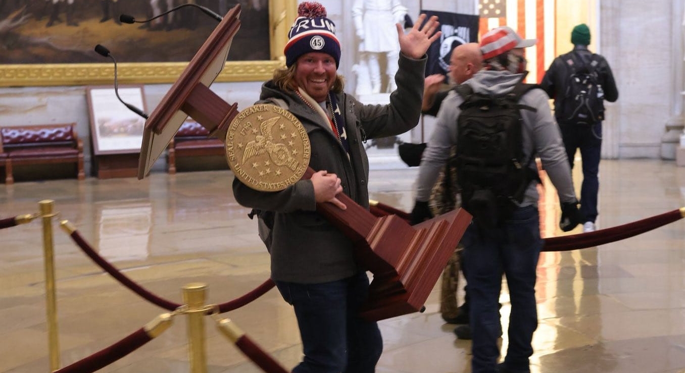 Police have arrested the Florida man who was pictured carrying U.S House Speaker Nancy Pelosi’s lectern from the House of Representatives chambers during the riot at the U.S Capitol.