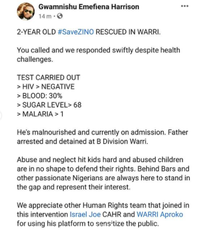 He’s malnourished and currently on admission. Father arrested and detained at B Division Warri.