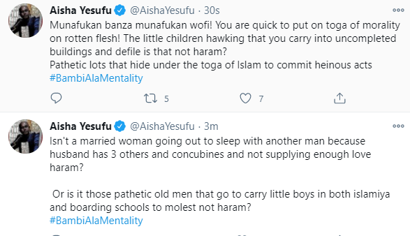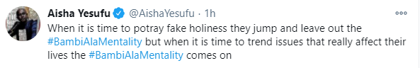 According to her, youths in other regions of the country pick on issues and push the government till they get results but Arewa Youths with their ”BambiAlaMentality” only know how to go from one handle to another attacking people and transferring aggression that they cannot transfer to their parents, who according to her, abandoned them.