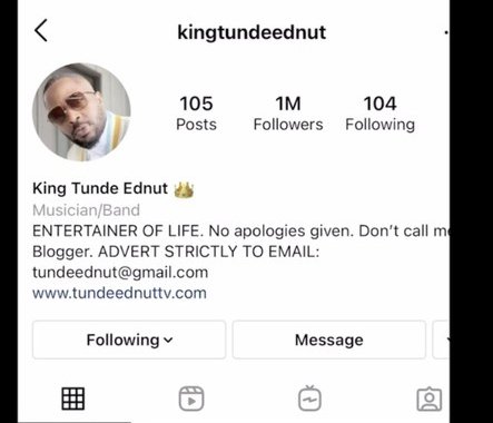 Ednut rejoined the platform with another handle (@kingtundeednut), on 10th January, after his first official Instagram account (@tundeednut) of over 2 million followers got banned.