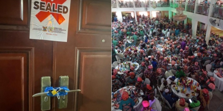 ”Lagos State Safety Commission and the Lagos State Task Force in a joint enforcement exercise, SEALED the Eko Club event centre in Surulere for complete disregard of Covid19 protocols at a funeral event which was held recently at the event centre.”