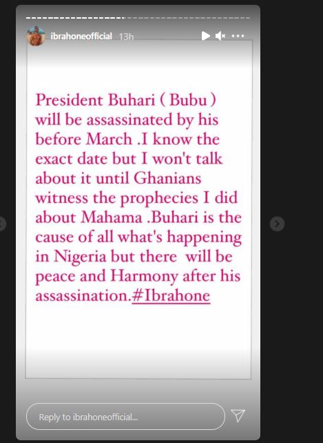 Well known self-acclaimed Ghanaian young million, Ibrahim Daouda popularly known as Ibrah One has disclosed in a new post on his Insta stories that the President of Nigeria, Muhammadu Buhari, will be assassinated before March 2021.