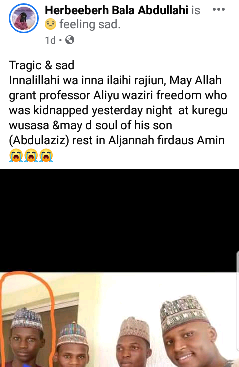 Professor Aliyu Muhammad has been kidnapped and his teenage son, Abdulaziz Aliyu killed by armed bandits on Sunday night, January 17 after the bandits stormed Wusasa in Zaria Local Government Area of Kaduna state.