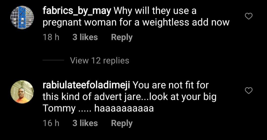 Another wrote: “You are not fit for this kind of advert jare…look at your big Tommy ….. haaaaaaaaaa.”