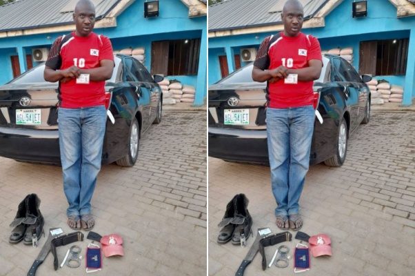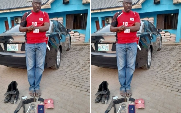 Exhibits recovered from the suspect include two warrant cards, one handcuff, one tear spray, one black belt, one red fez cap, one black belt, one cutlass and one Toyota Camry black colour with registration number: AGL 541 ET.
