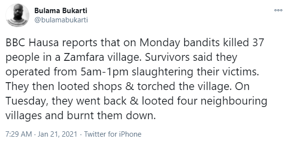 ”BBC Hausa reports that on Monday bandits killed 37 people in a Zamfara village. Survivors said they operated from 5am-1pm slaughtering their victims. They then looted shops & torched the village. On Tuesday, they went back & looted four neighbouring villages and burnt them down.”