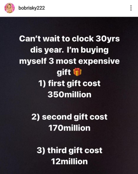 Can’t wait to clock 30yrs this year. I’m buying myself three most expensive gift. First gift cost N350million, second gift cost 170million, third gift cost 12million.