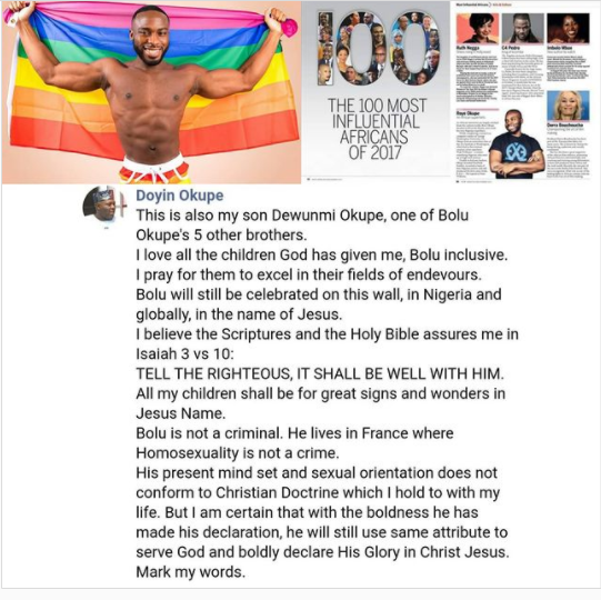 Former presidential aide, Doyin Okupe has not stopped talking about one of his sons, Bolu who recently came out as a gay man.