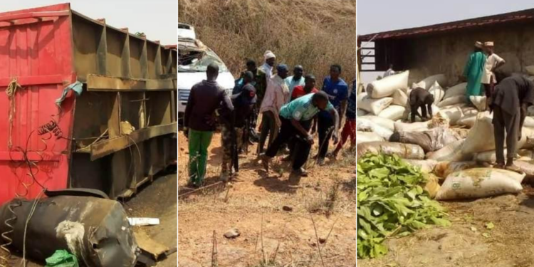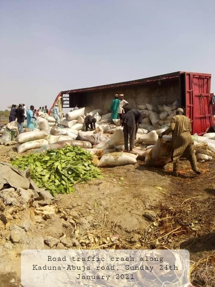 The crash involved a trailer conveying grains and motorcycles to Abuja and was caused by a combination of speeding and driving against the direction of traffic. These caused the trailer to veer off the pavement and tip over on its side, as seen in the pictures attached.