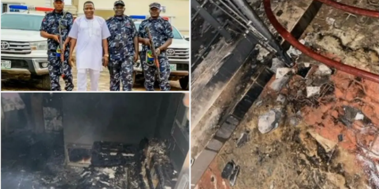 The Oyo state police command has said hoodlums who rode in a hummer bus and a Micra stormed the apartment, fired sporadic gunshots before setting the house ablaze.
