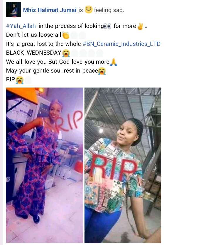Meanwhile friends and colleagues have taken to Facebook to mourn the workers. Two of the deceased have been identified as Halimat and Fali.